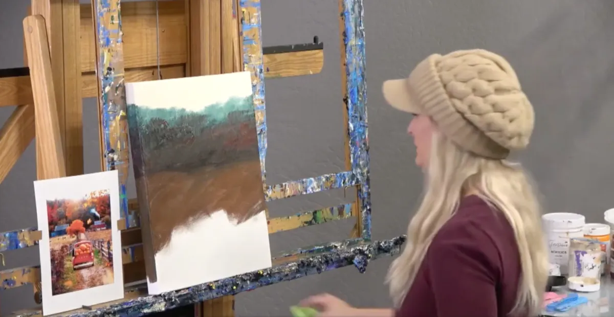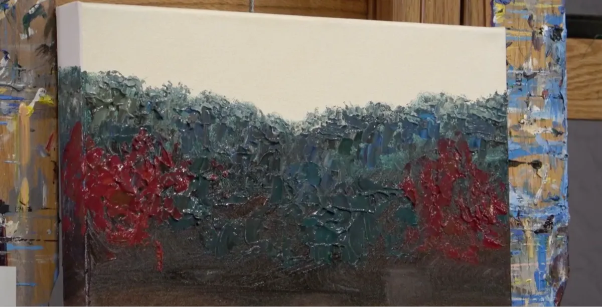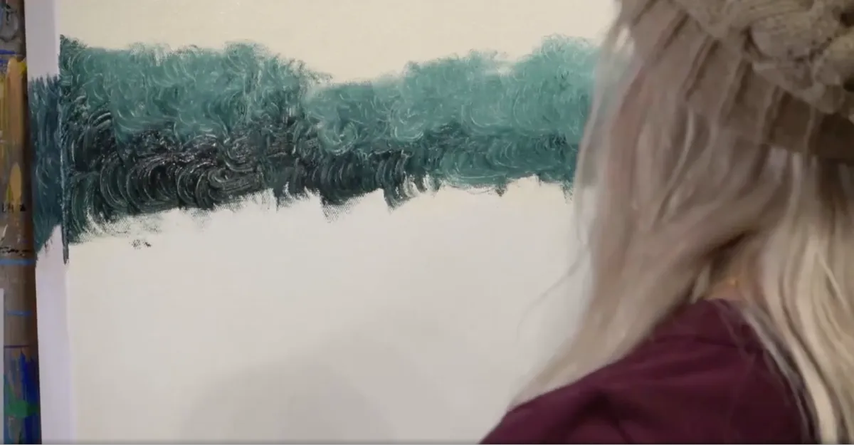 Swooshing the tree line into life. With a few more swirls and drags across your canvas, you’ll create the perfect natural treeline beneath the afternoon sky. It’s as easy as wiping your counters and pretty much the same simple motion any beginner can master in seconds.
