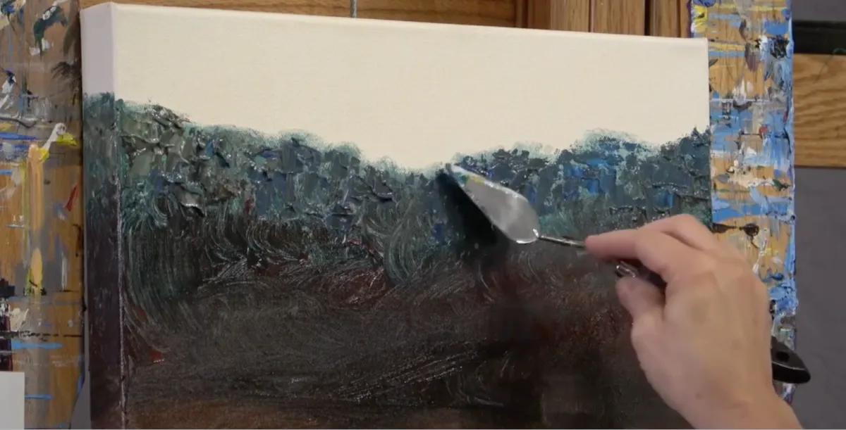 The “throw down.” This messy move with your palette knife creates that realistic country road mixture of gravel and dirt almost instantly.